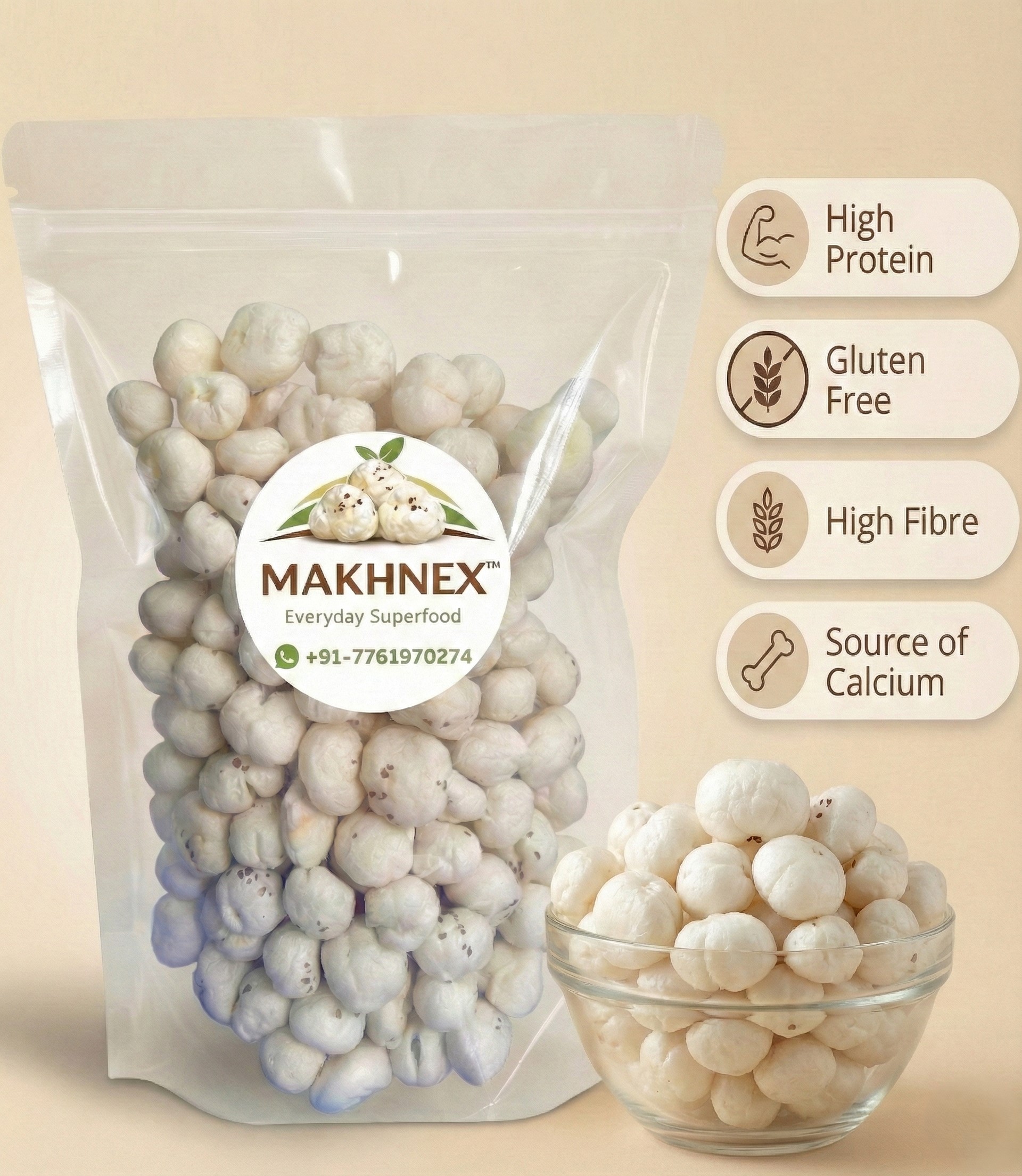 MAKHNEX Jumbo Hand-Picked Makhana (Fox Nuts) are crunchy, premium-grade fox nuts sourced directly from trusted farms in Bihar. Carefully selected for large size, superior crunch, and purity, these makhana are nutrient-dense and naturally gluten-free, making them ideal for everyday healthy snacking. Rich in plant protein, dietary fibre, and essential minerals, MAKHNEX makhana are perfect for dry roasting, light seasoning, fasting recipes, or enjoying as a guilt-free snack with tea or coffee. Hygienically processed with no additives or preservatives, they deliver authentic taste with premium quality in every bite.